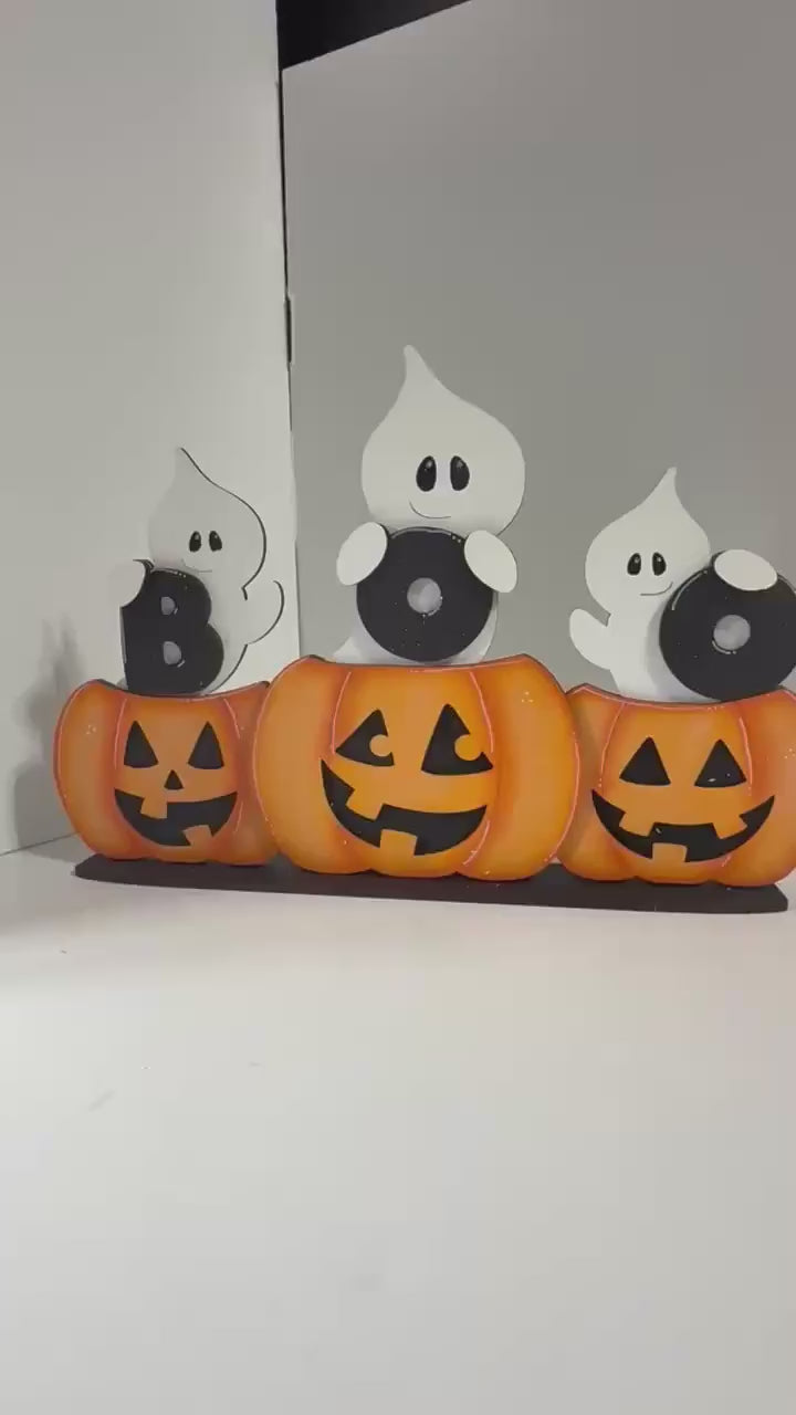 Add a playful “Boo” to your Halloween décor with our DIY Ghost Boo Standing Shelf Sitter! This adorable 14" x 5" design features three smiling ghosts peeking over pumpkins, each holding a letter to spell “BOO.” Perfect for shelves, mantels, entry tables, or tiered tray backdrops, this piece is a festive and fun paint project.
