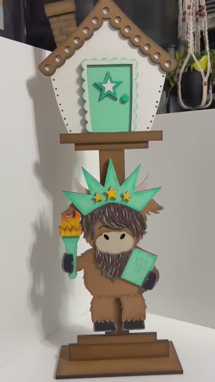 Bring liberty and laughter to your summer decor with this DIY Highland Cow Birdhouse Insert! 🐮🗽 Dressed as Lady Liberty, this patriotic Highland cow holds a torch and July IV book, ready to light up your interchangeable birdhouse for Independence Day!