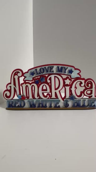 Create your own patriotic masterpiece with this DIY Patriotic Shelf Sitter! This laser-cut wood blank features the phrase "Love My America, Red White & Blue" in a beautifully detailed design, perfect for celebrating the Fourth of July, Memorial Day, or any USA-themed decor.