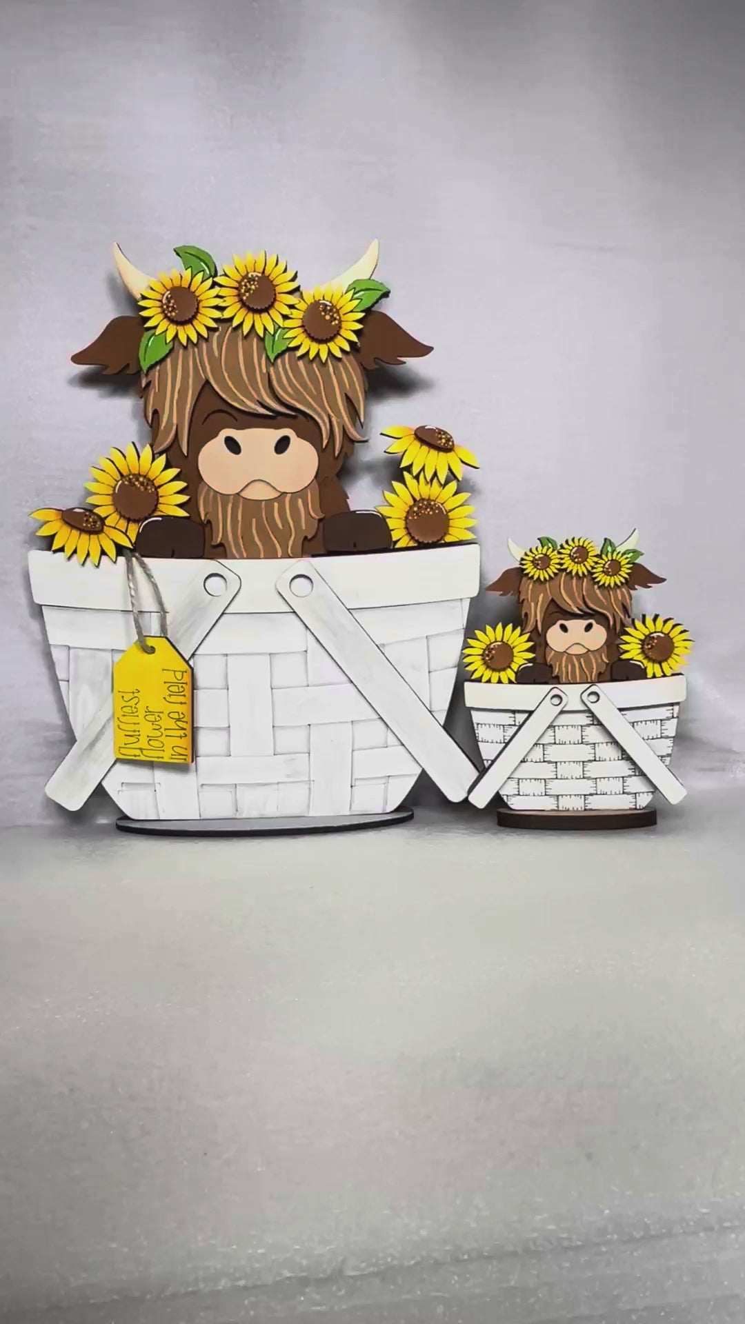 The highland cow basket insert is a charming wood paint kit designed to bring rustic farmhouse decor and country style decoration to your seasonal home accents. This flower basket decor features a delightful highland cow surrounded by vibrant sunflowers, creating a sunflower basket insert that fits perfectly in our interchangeable basket (sold separately). Crafted from laser cut wood art, this DIY wood painting kit offers a fun and creative way to paint your own basket and add hand painted basket decor to your farmhouse flower basket collection.